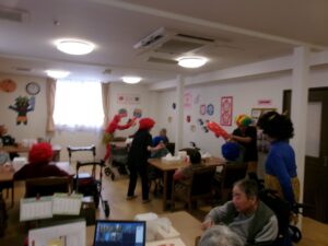 鬼に扮した職員と利用者さんに、大きな声で「鬼は外、福は内」と豆まきが始まり「懐かしいね」「楽しい」と童心に返っていたかのように楽しまれていました。